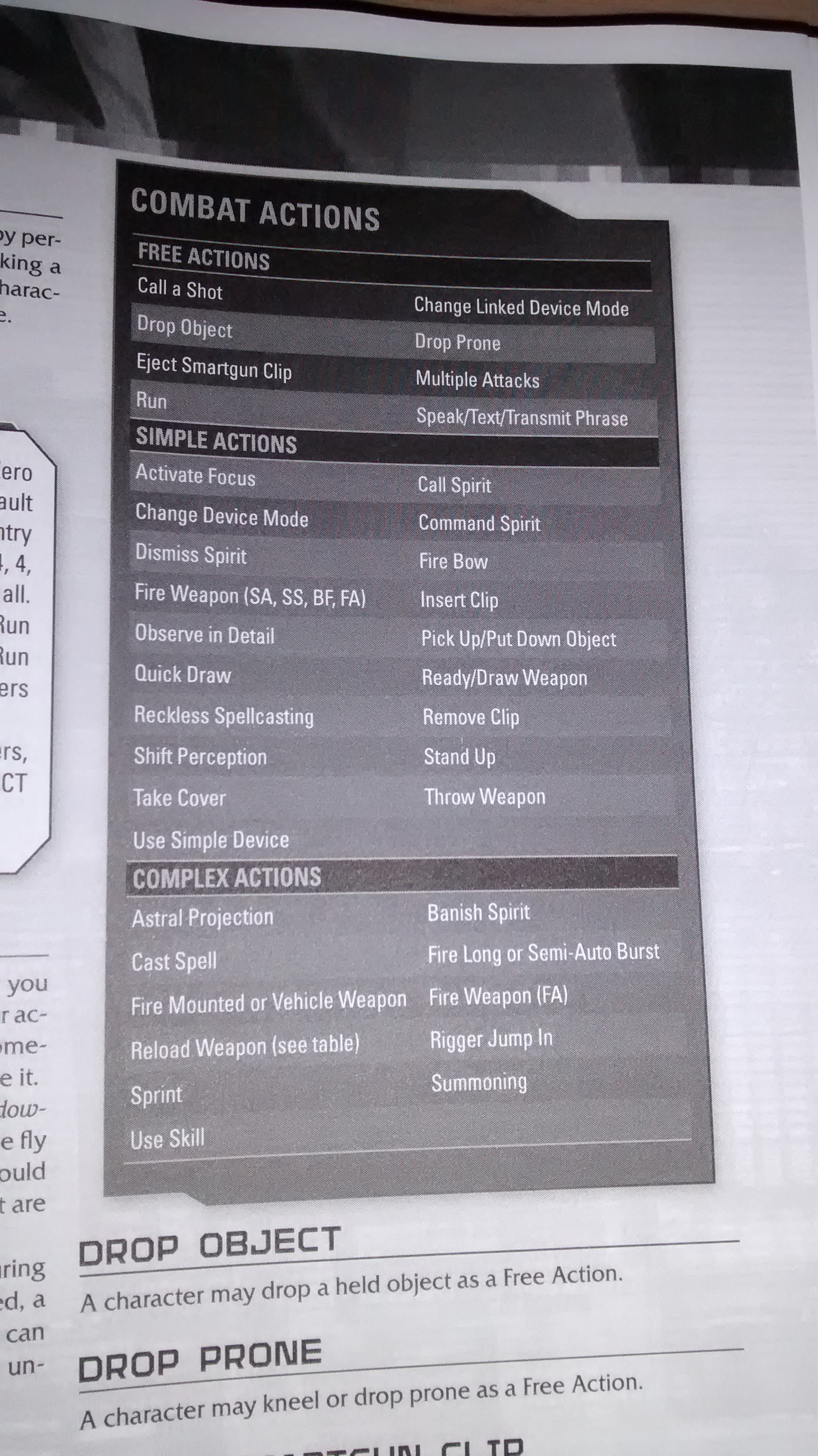 Instead of a d20 like d&d, Shadowrun uses the ‘good old’ d6. Every 5 or 6 rolled is a ‘hit’ and your stats and skills determine how many dice you roll, plus or minus any modifiers. So for example if you’re trying to jump a gap, rather rolling a d20 and adding your +4 acrobatics skill to try to reach a DC of 15, you would roll 7d6 (using your agility stat and gymnastics skill) to try to get 3 hits. And if you were trying to jump that gap from a slippery surface you might lose a die, so that you’re rolling 6d6 instead.